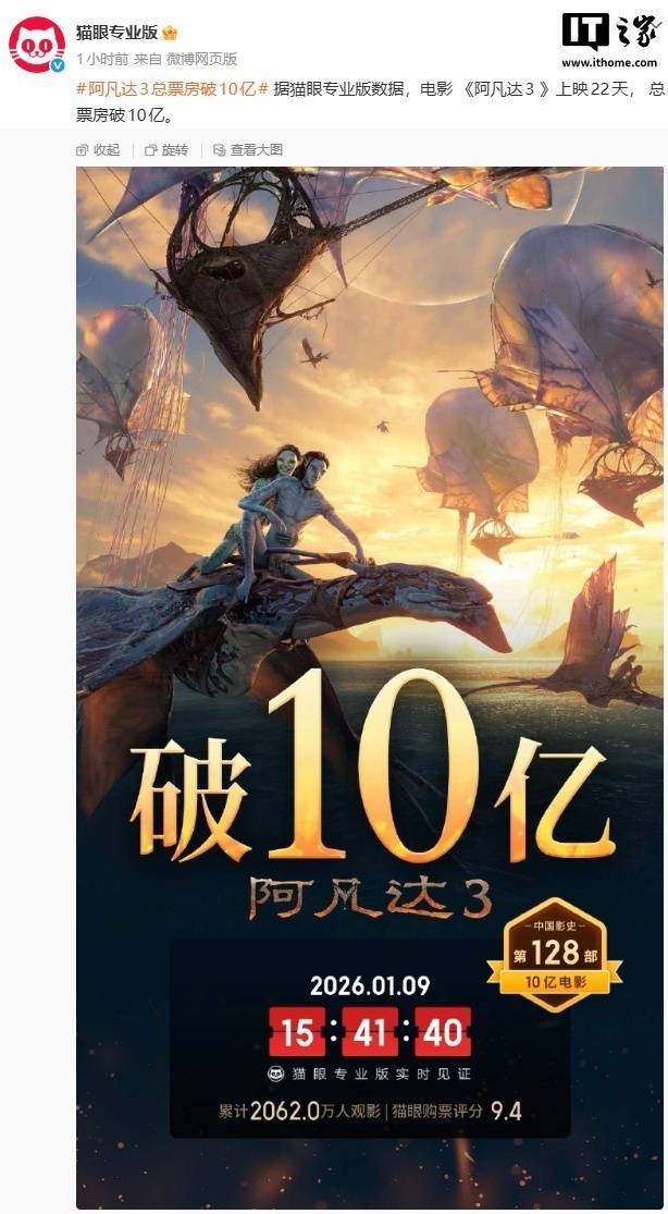 IT之家 1 月 9 日音书开云体育,据猫眼专科版数据,科幻电影 《阿凡达 3 》上映 22 天,总票房破 10 亿,这亦然中国影史第 128 部 10 亿电影。此外,该影片晓谕密钥宽限,延迟上映至 2026 年 2 月 18 日。