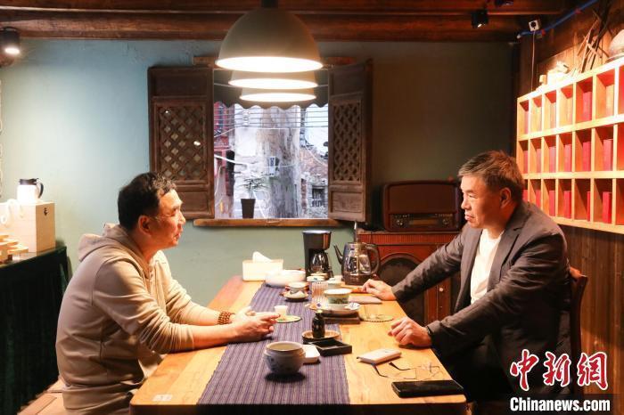 林海(左一)向“同顺泰”茶肆肃穆东说念主了解想法情况。 王婷婷 摄