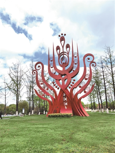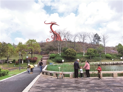 行至一小山坡下,记者昂首望去,一座生气勃勃的凤凰头雕像傲然伫立,仿佛正引领欲鸣,与湖对岸舒展的凤凰尾雕像遥遥相望,为这片湿地增添了几分祯祥之气。