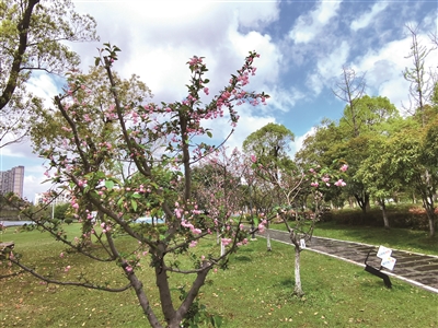沿着湖岸走过一块块青绿草坪,几棵海棠花片刻撞入眼帘。粉红花瓣重重叠叠,像青娥晕开的笑靥,微风拂过,花瓣簌簌飘落,空气里饱和着清甜花香。偶尔有花瓣落在肩头,伸手轻拂,指尖便沾了一抹春的气味。
