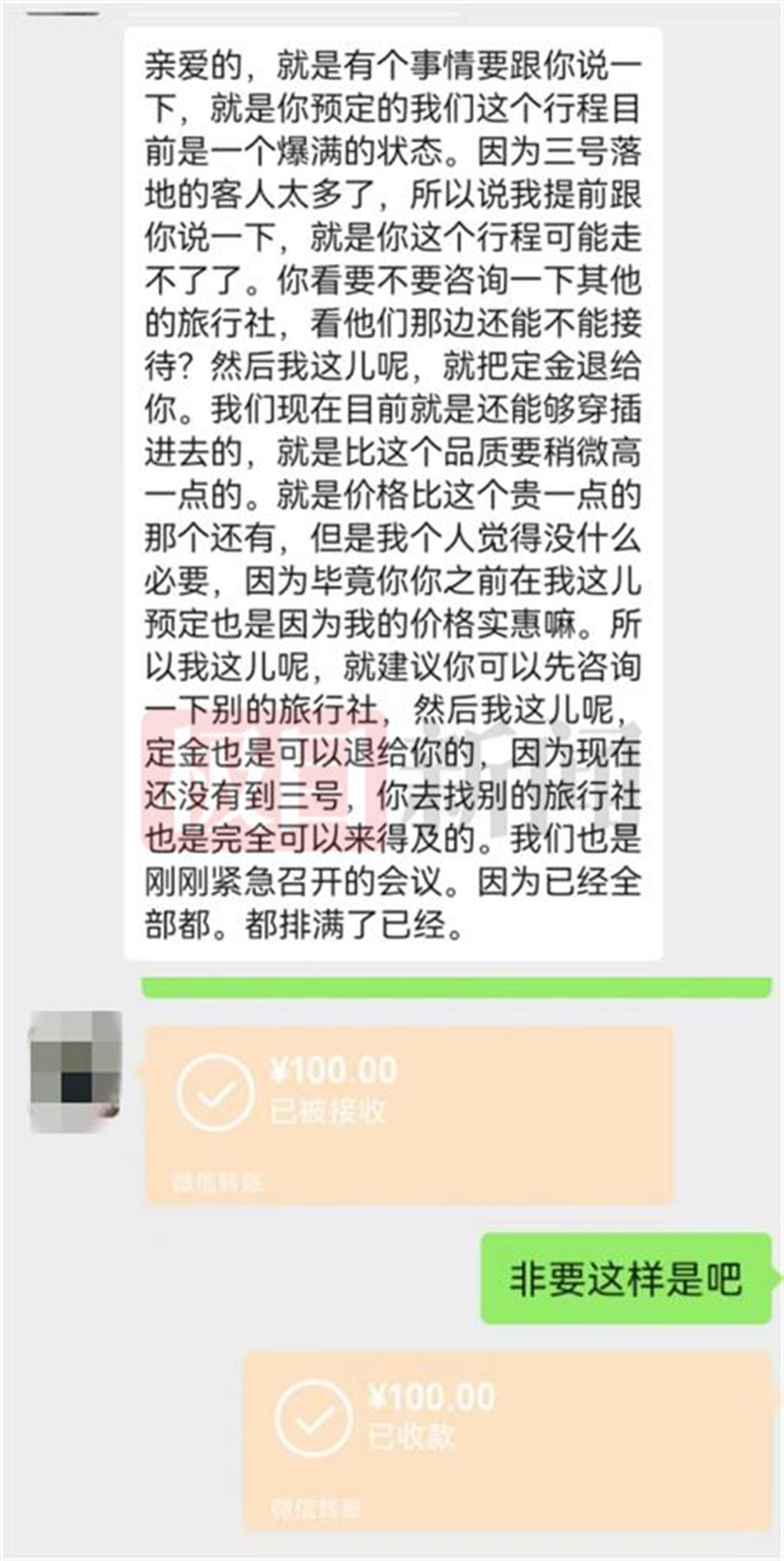 走完经过后,吕女士静等爽直假期到来。不虞3月31日,小叶瞬息找到吕女士,说她报的团因为爽直东说念主多爆满,需要加价300元升级,否则就退定金取消行程。吕女士默示活气后,小叶退还其100元定金,随后将其拉黑。