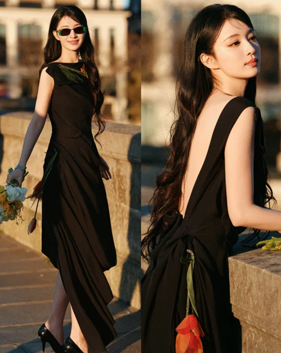 玄色长裙上点缀着橘红色的立体花草,不秩序的领口裙摆更灵动洒脱,露背的筹划带有一点性感。