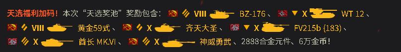 成为天选之东谈主后可从天选奖池中自选一个奖励,内部有酋一万和BZ-176等强力坦克。另外门票自己的自选奖励还不会和天选奖励互斥,抽到天选奖励后照旧不错领取正本的自选奖励!