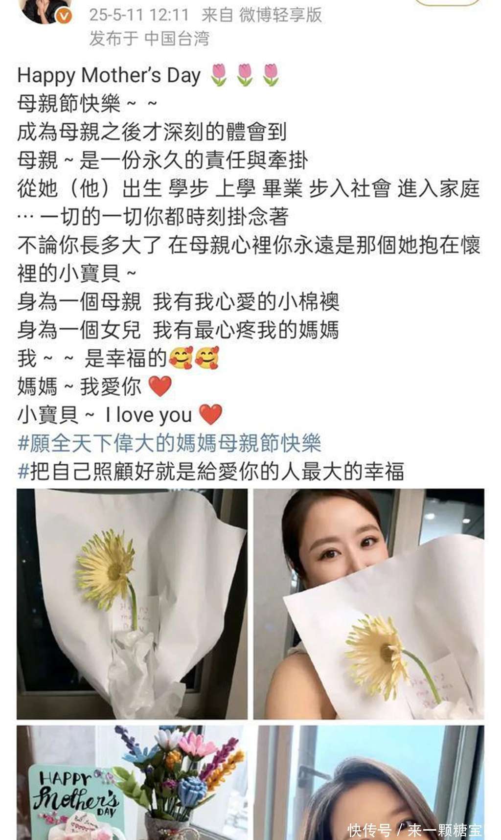 林心如发文那口吻,满满的幸福感:“身为一个母亲,我有我喜欢的小棉袄,身为儿子,我有最醉心我的姆妈,我是幸福的,姆妈我爱你,小宝贝,我爱你。” 啧啧啧,这话说得,甜到齁!