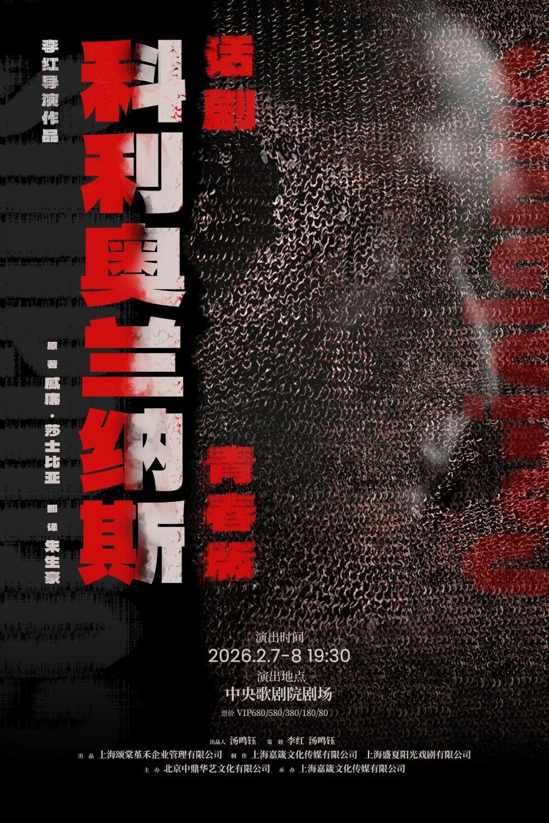 2月7日、8日,由李红执导的芳华版《科利奥兰纳斯》在中央歌剧院戏院首演。上演在忠于朱生豪译本的文本框架下,以颇具分量感的舞台安装和极简视觉,搭配后生演员为主的班底,为这部莎士比亚的罗马悲催带来了一种刚柔并济的至极阐释。