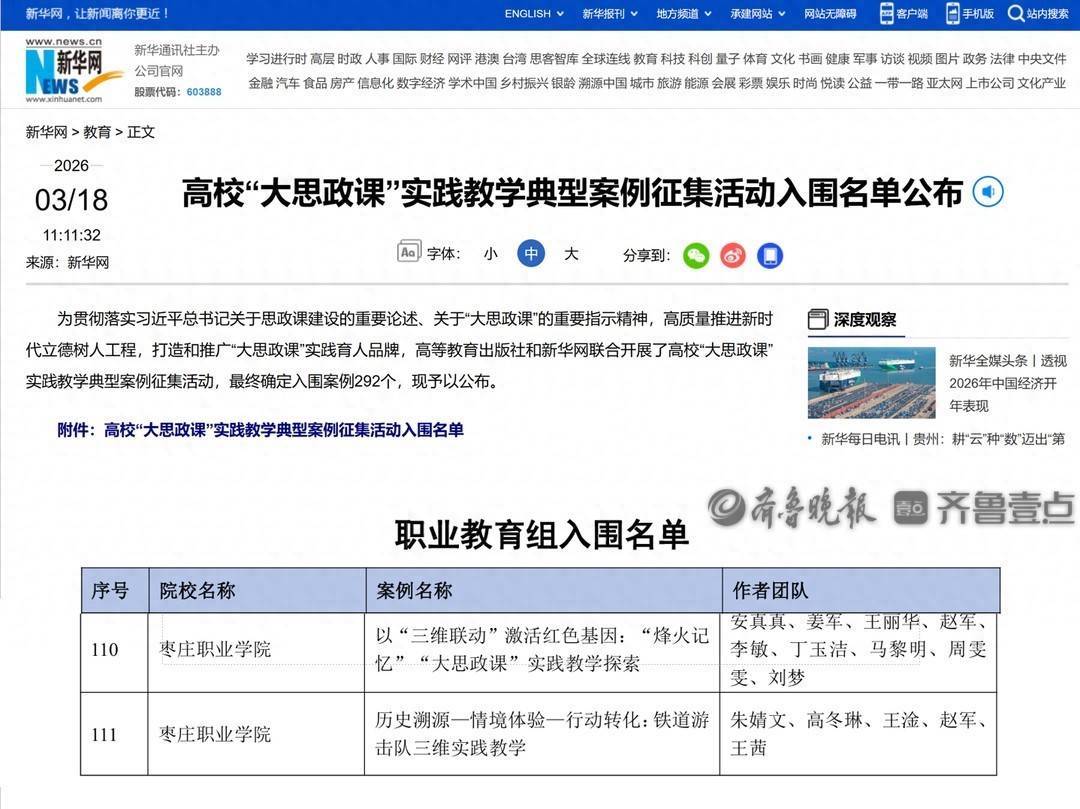 近日开yun体育网,由高级西宾出书社、新华网结合专揽的天下高校“大想政课”执行教学典型案例搜集活动成果揭晓,枣庄作事学院马克想观念学院提交的两项教学案例得胜入选。