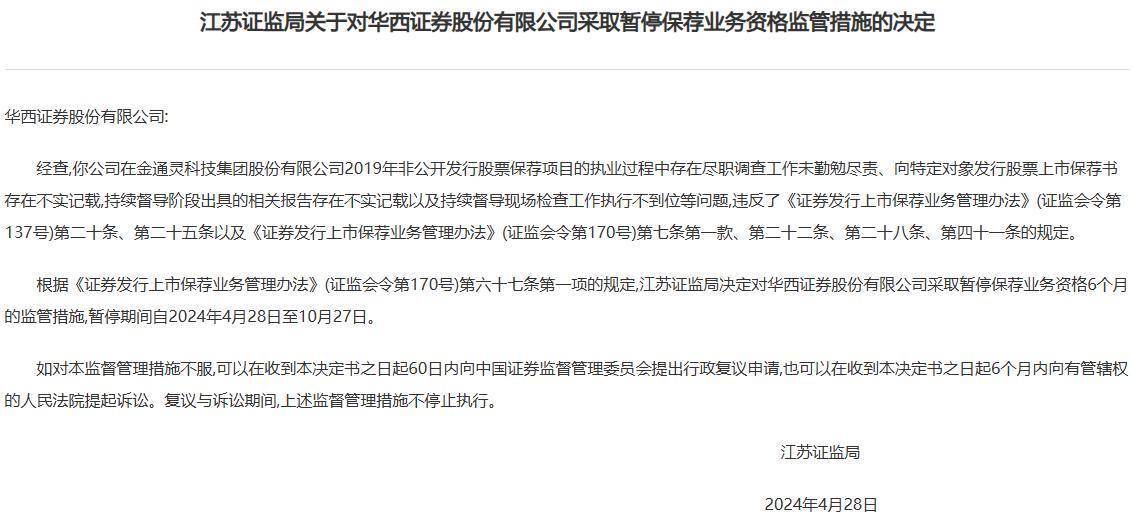 2024年4月28日,江苏证监局决定暂停华西证券保荐业务经验6个月,原因是在金通灵2019年非公诞生行股票保荐项筹商执业历程中存在守法访问责任未发愤尽责、向特定对象刊行股票上市保荐书存在不实纪录、握续督导阶段出具的相干陈述存在不实纪录以及握续督导现场查验责任奉行不到位等问题。